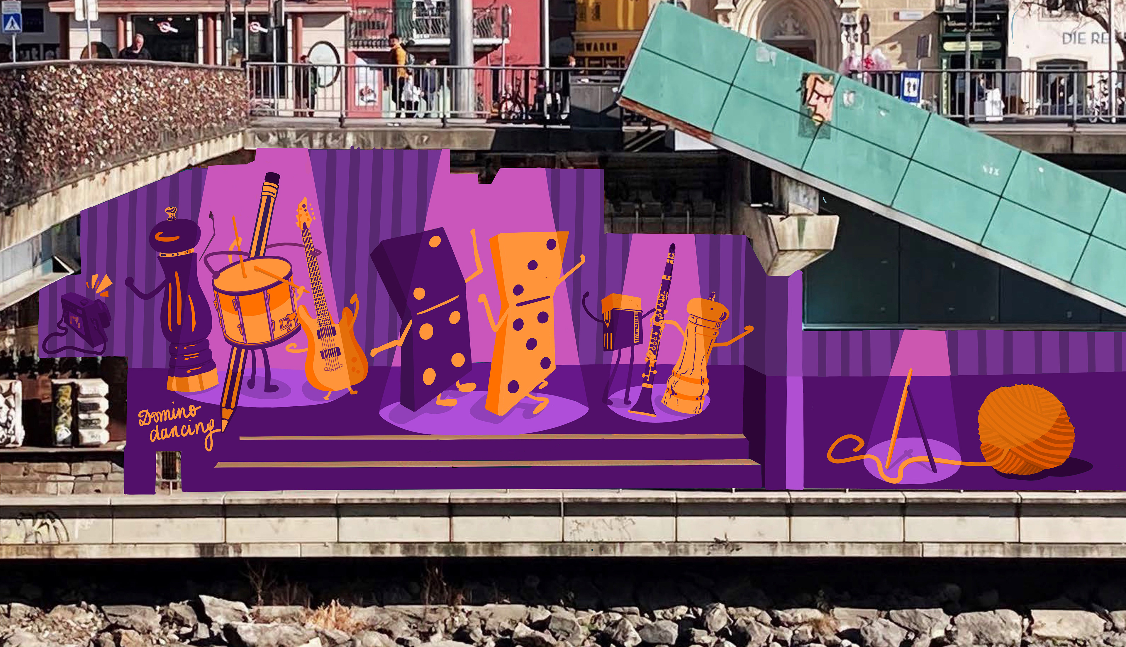Inspired by the song "Domino Dancing" by the Pet Shop Boys, I came up with the idea on the left, which I later further developed for a Mural Design competition for the CityPeach event space in Graz.
